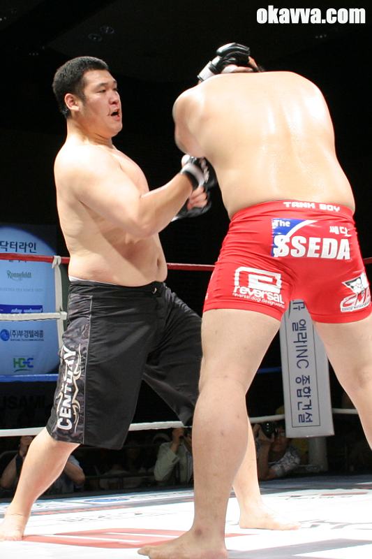 『K-1 MAX KOREA』で、ヴァージル・カラコダに勝利したことのあるキム・セギは朴訥とした雰囲気だが、コミカルなしゃべりや入場でもコスプレで登場するなど、茶目っ気のあるファイター。試合は乱打戦でもガッツを失わず、前に出まくるファイター。対するハン・スーファンはご存知、DEEPの前ライト級王者で中尾受太郎、三島☆ド根性ノ助、横田一則をKOしているという韓国の剛腕MMAファイター。